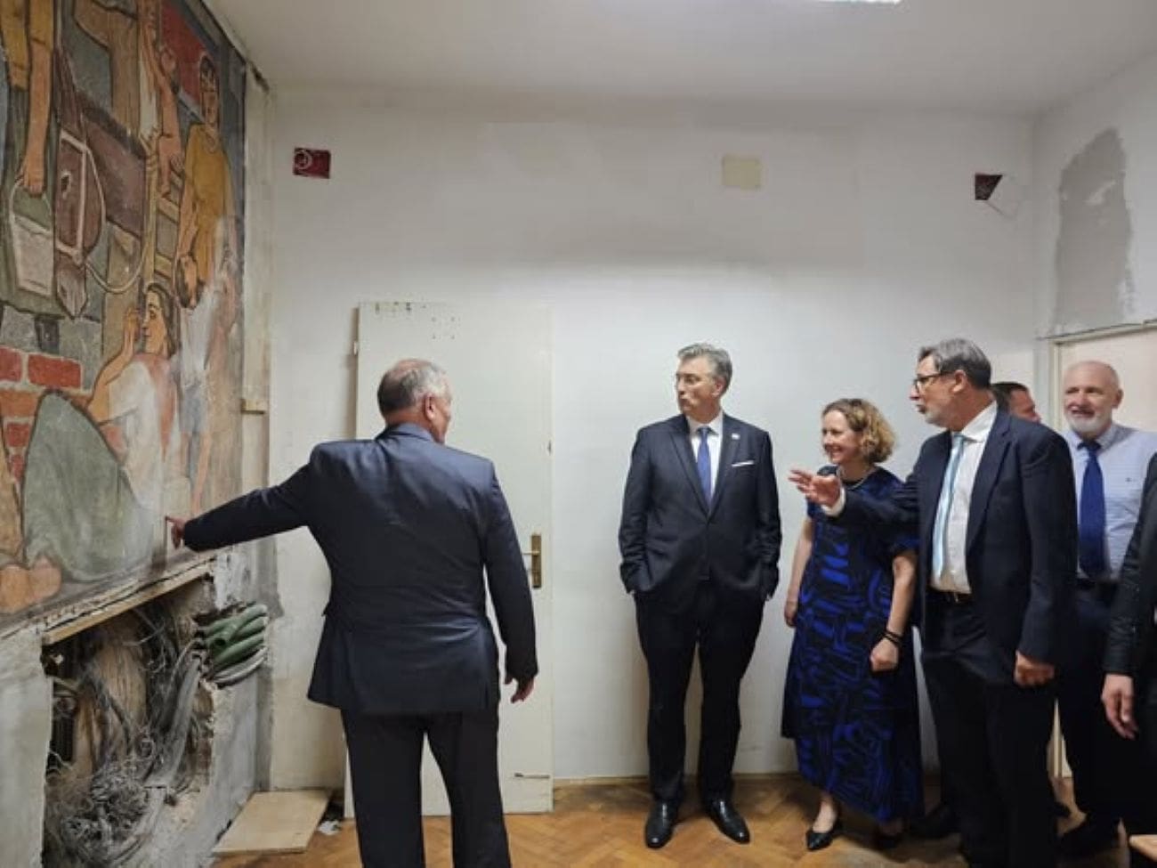 Prije početka službenog sastanka u zgradi Splitsko-dalmatinske županije, župan Blaženko Boban poveo je predsjednika Vlade Andreja Plenkovića i ministricu kulture Ninu Obuljen Koržinek u razgledanje nedavno otkrivene freske u prizemlju županijske zgrade.