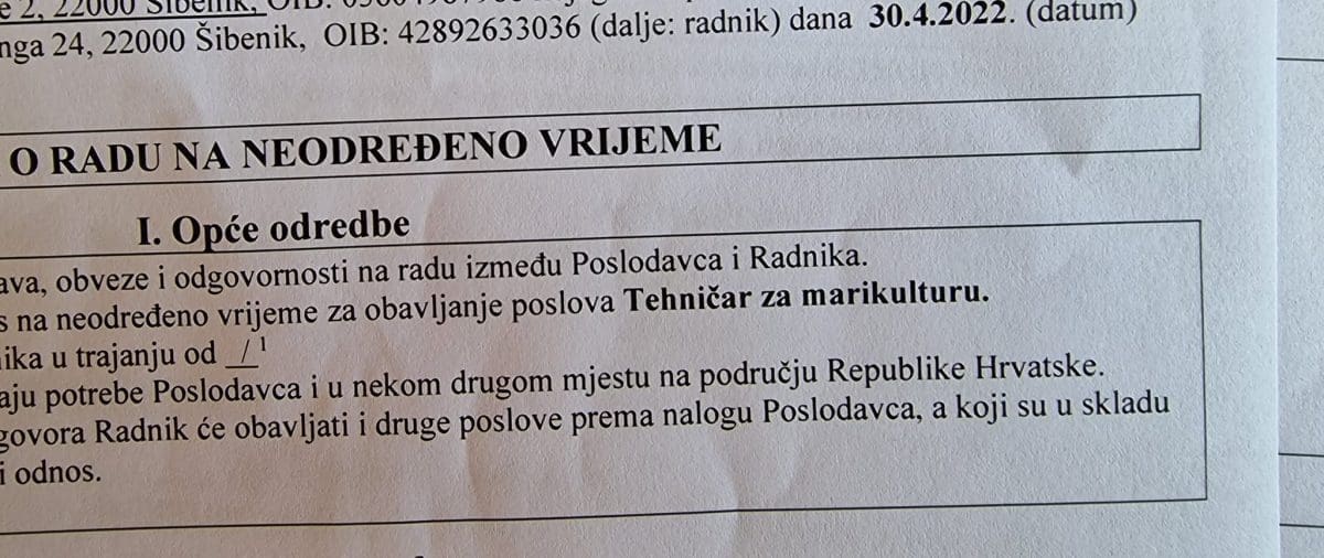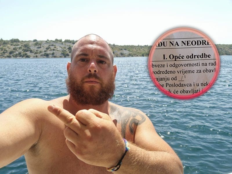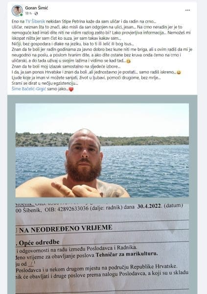 Objavi je priložio dvije fotografije. Na jednoj sam Šimić, uz more bez majice i u ljetnom izdanju, pokazuje "prst", a na drugoj fotografiji je slikao ugovor o radu na neodređeno vrijeme.