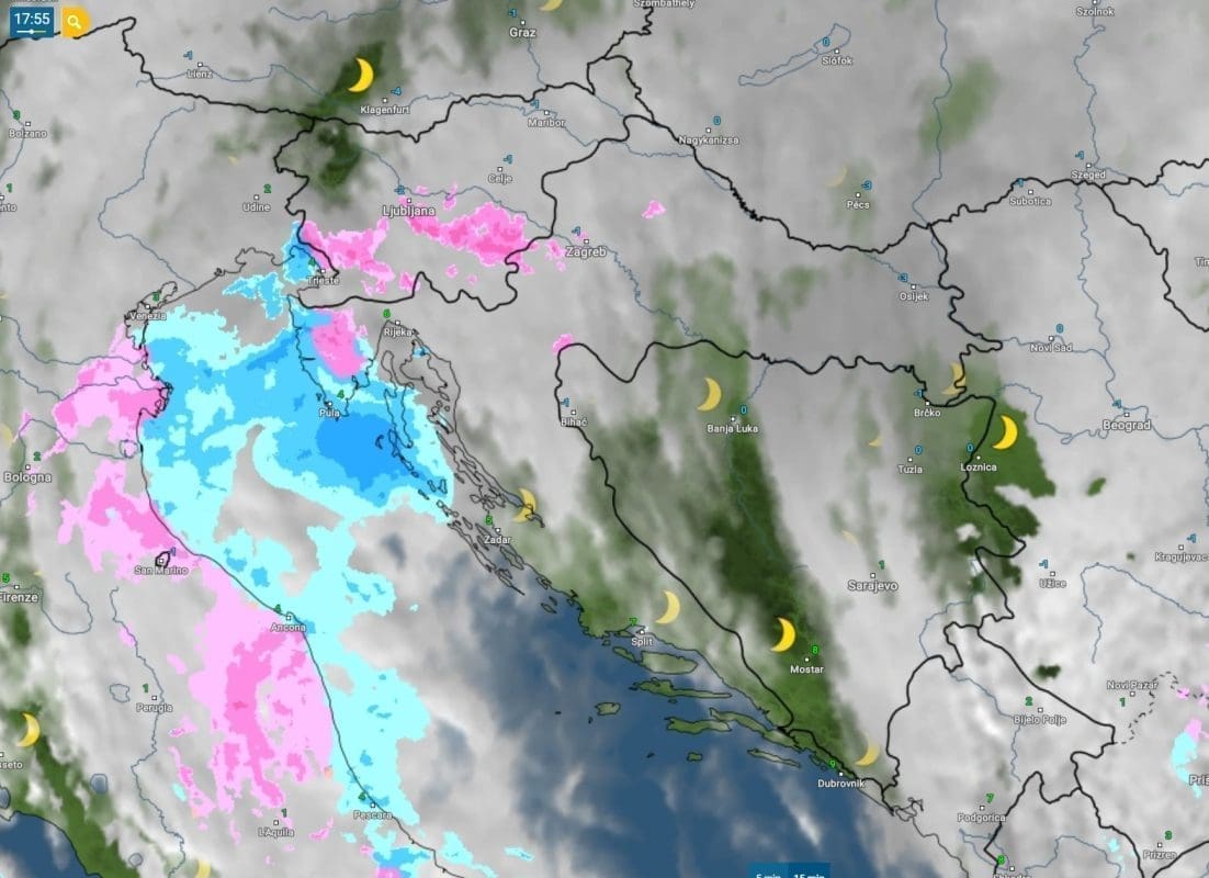 Dok je u Dalmaciji nedjelja protekla u znaku suhog vremena, u Istri se poslijepodne naoblačilo, a dio unutrašnjosti poluotoka već je zabijelio tanak snježni pokrivač. Tamo su večeras temperature od 0 do 2°C, a uz obalu pada kiša pri niskim temperaturama od 3 do 5°C.
